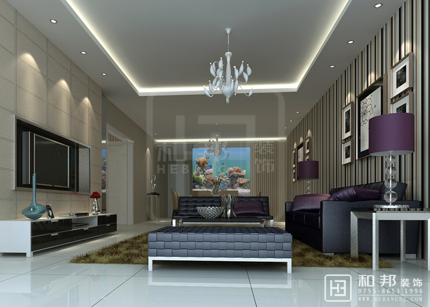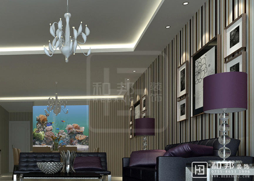 客廳的沙發(fā)墻面的線條與電視墻的墻面有著“天輕地重”的舒適視覺感,抱枕使用了紫色,與黑色沙發(fā)的相得益彰很舒適、溫和,這種裝飾效果形成對比的層次美感。